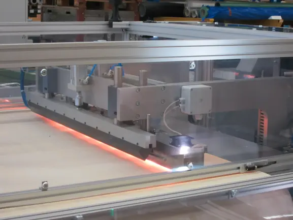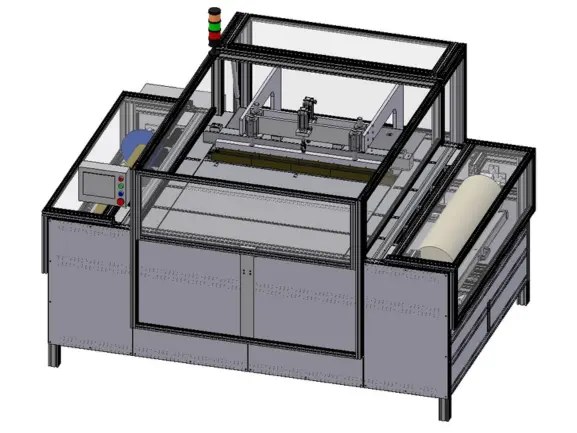 FPO-Membran dient in der Baubranche zur Abdichtung von Flachdächern. Vor dem Verlegen wird die Folie auf einer speziellen Maschine heiß geprägt, damit sie gut in die Ecken passt. Die Anlage besteht aus: Abroller, Prägesystem (Heizstrahler und gekühlter Stempel), sowie Vorschub- und Aufroller. Die Membran wird zunächst mit heißer Luft erhitzt, dann am Prägewerkzeug geformt und abgekühlt. Danach wird das Material zurechtgeführt, aufgewickelt und von der SPS gesteuert überwacht.