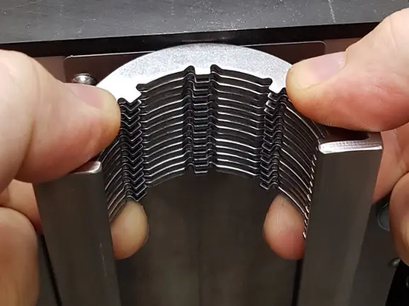 Bis zu 30 unterschiedliche Anlaufscheiben mussten entweder vom Förderband oder aus einem Magazin übernommen, beschriftet und anschliessend sortenrein gestapelt werden. Dabei waren kurze Umrüstzeiten und eine benutzerfreundliche Verstellung wichtig.